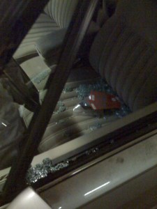That’s what greeted me in my garage one morning. Our garage gate broke down that night and someone came in and smashed a few car windows looking for valuables. Although my car doesn’t scream high living, my white ipod charging cord may have. When I showed up in the morning the police were there and they even dusted my car for fingerprints. What fun. Now I have a dilemma: get a new window? Or weld the door shut and go in and out of my car “Dukes of Hazard”-style?