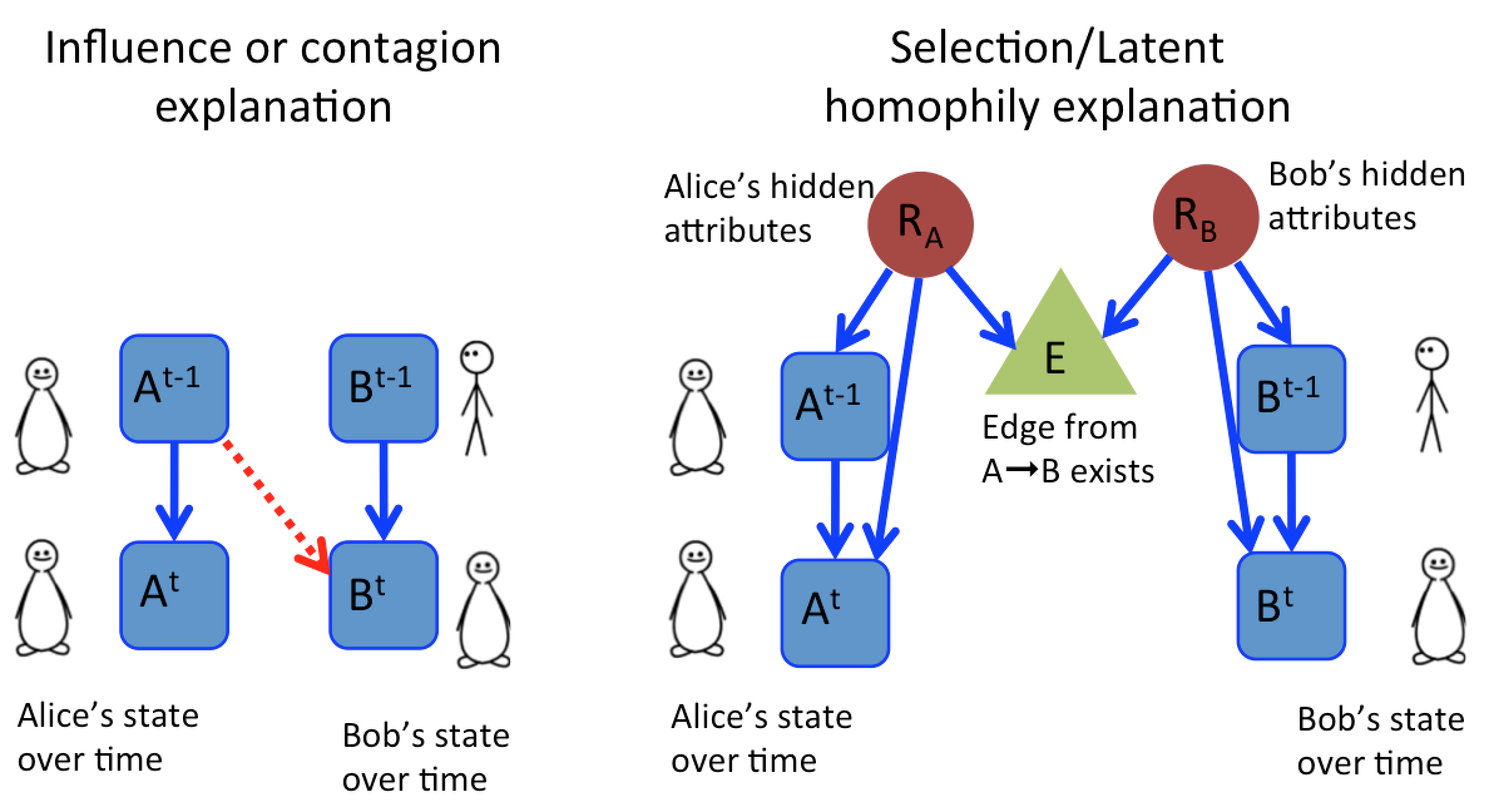 If you’ve been reading science news, you’ve seen over the years that obesity, happiness, loneliness, and divorce are all contagious. Just a few weeks ago, I read that grades are also contagious. Certainly, it’s not surprising to find out that friends’ behaviors are correlated on all these fronts, but is that enough to say for sure that your friends cause you to become more obese/happy/lonely etc.?