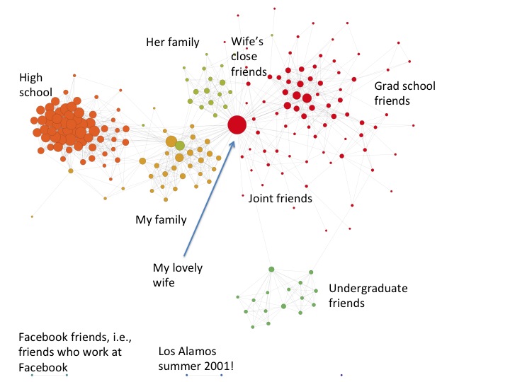 Thanks to the magic of Mathematica 9, you can now make pretty pictures of your social networks with a single command. I was impressed by how well it automatically captured the true structure of my network, which I labeled and included below. I’m not sure what you can conclude about me as a person, except that I’m happy to route all socializing through my more extroverted wife. It’s probably also pretty clear which parts of my life are geographically separated.
